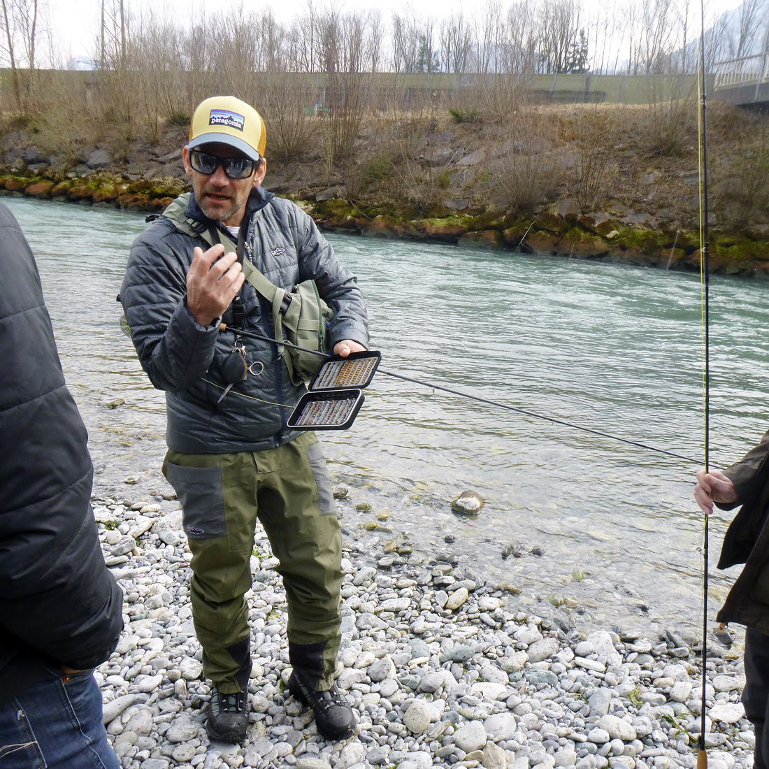 Frisch gestärkt, ging es in die Praxis an die Ill und Stoffel zeigte am Wasser, was alles zu beachten ist um die Nymphe perfekt mit der Fliegenrute zu präsentieren.